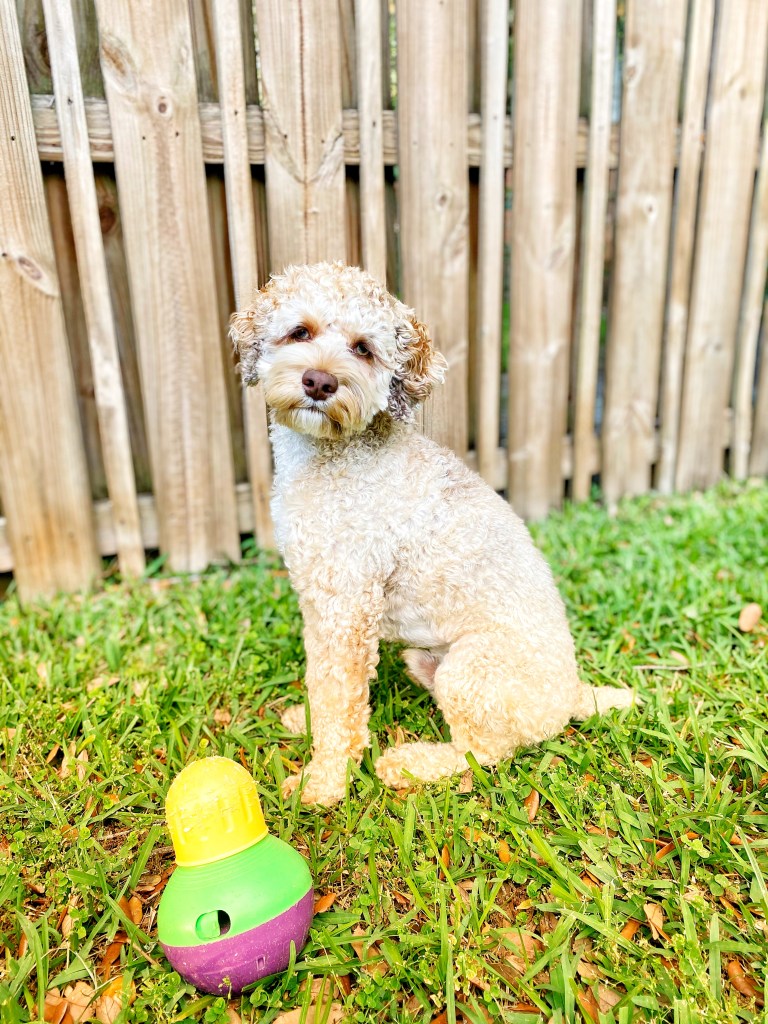 I use the Starmark Bob-a-Lot (size small) for dispensing a portion of our pup Rye Lee’s kibble for his morning and evening meals. The yellow cap easily unscrews so you can dump a scoop of kibble or treats in all at one time. You can adjust the opening from the top to bottom sections as well as the opening on the outside of the green section to make the difficulty level easier or harder. I also love the Bob-a-Lot for its durability. We bought a few other treat dispensing balls that Rye Lee broke after a few weeks because he hit them hard against the wall. We’ve had the Bob-a-Lot for about a year now and it still is in great shape. You can find the Starmark Treat Dispensing Bob-a-Lot Dog Toy on Amazon or Chewy.