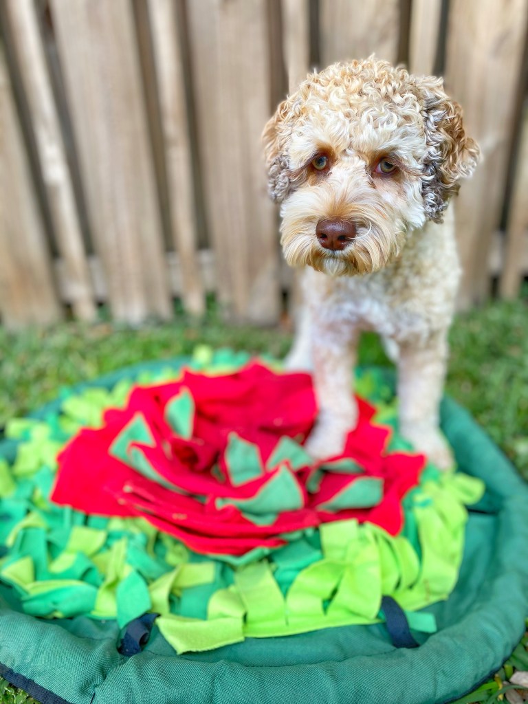 The Sniffiz Snuffle Mat is my second favorite puzzle toy for dogs because you have many areas to hide treats or kibble. The outer, grassy portion of the mat is low difficulty. For added difficulty and increase mental stimulation, you can hide treats in the folds of the red, center portion. This mat is also very durable and easy to wash. You can throw it in your washing machine and it comes out looking good as new. Another pro is that the mat is soft and stays in one location, which means it’s QUIET! The average treat balls are very noisy since you’ll hear the treats ratting around inside or the ball banging against the wall. In addition to the mat, Sniffiz includes five extra stimulating puzzles like a treat ball that goes inside three pockets. You can purchase the Sniffiz SmellyMatty Snuffle Mat on Amazon or on the Sniffiz website.